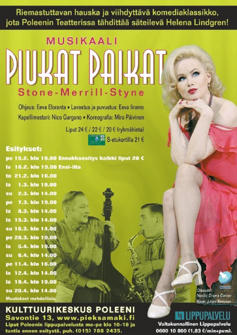 Musikaali Piukat paikat on riemastuttavan hauska ja viihdyttävä komediaklassikko, jota Poleenin Teatterissa tähdittää säteilevä Helena Lindgren. Luvassa on romanttista hassuttelua ja meheviä kommelluksia upeiden tanssi- ja laulunumeroiden siivittämänä.